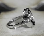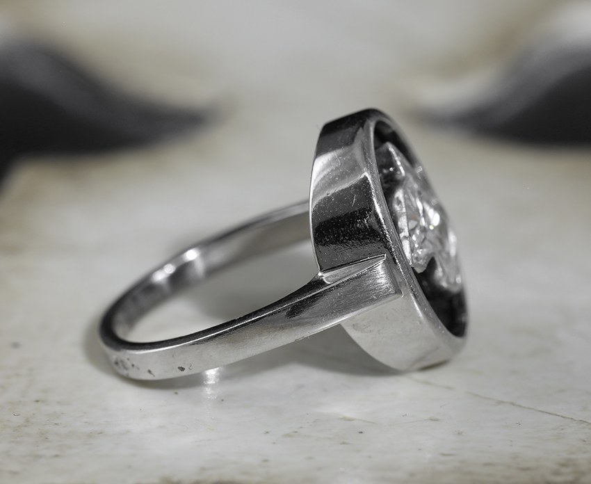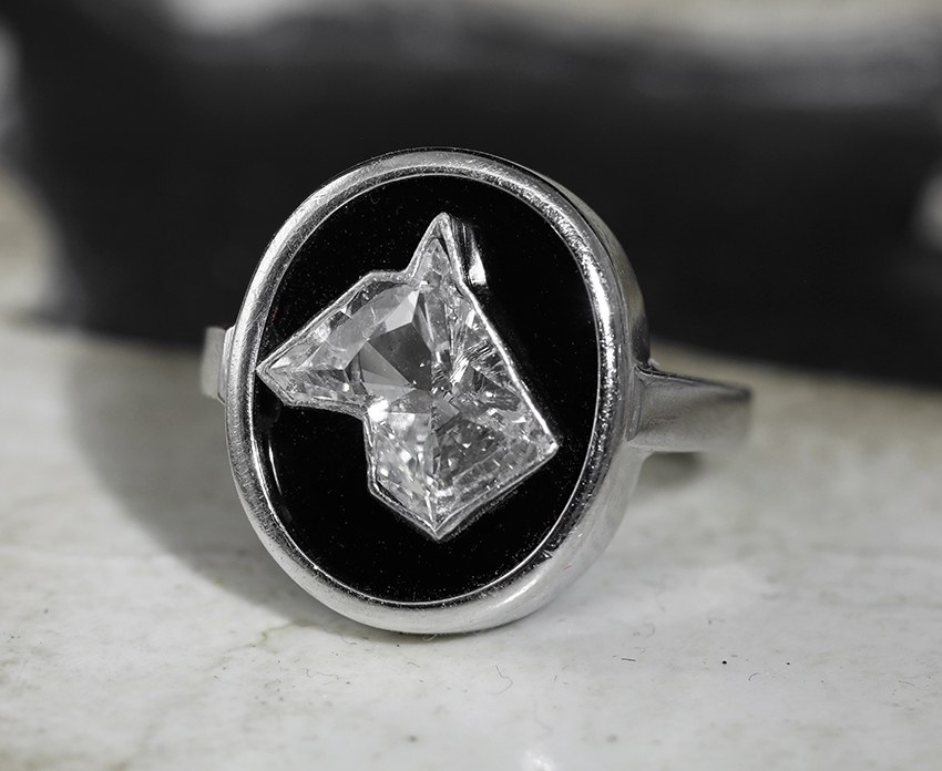 Très originale bague de petit doigt Art Déco en or gris et platine, le chaton ovale présente un diamant taillé à facettes en forme de tête de chien (poids du diamant autour de 1 carat), sur fond d’onyx.France, vers 1930