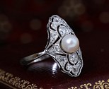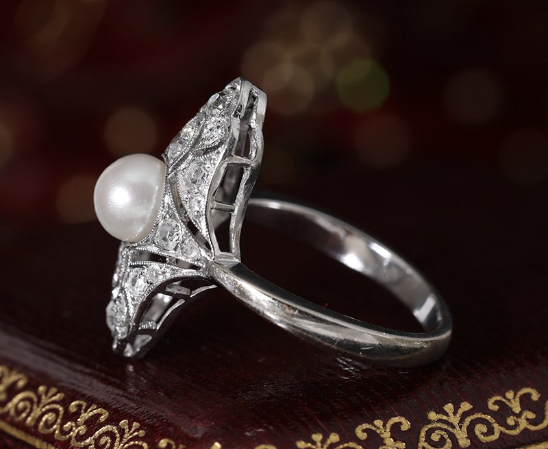 Bague ancienne Art Déco en or gris sertie de diamants et d'une perle.