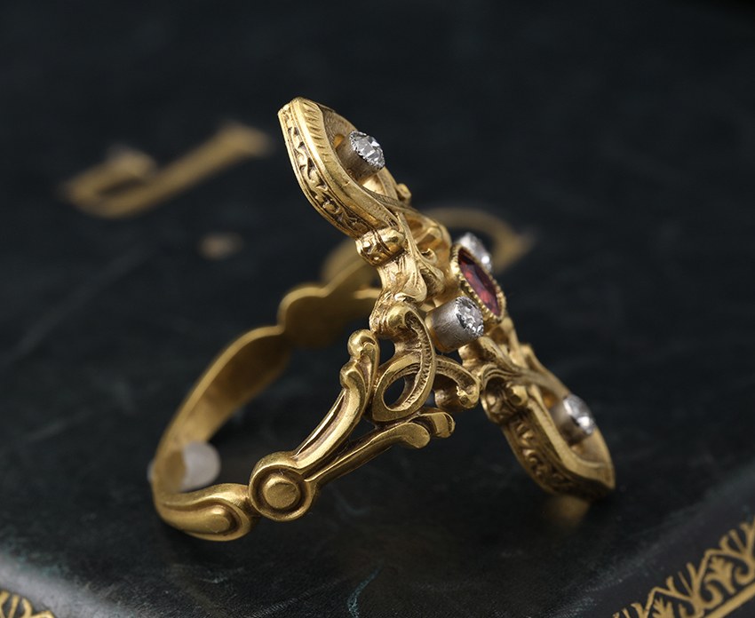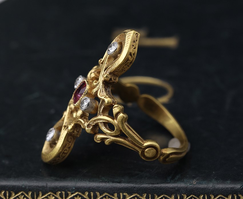 Magnifique bague en or ciselé et patiné, d’un style librement inspiré du style gothique. Le chaton transversal et orné d’un très joli rubis birman d’un rouge vif, encadré de 4 petits brillants sertis en platine. Travail du maître orfèvre Maurice Kalmanovich, d’origine russe, installé à Paris en 1904.France, vers 1905