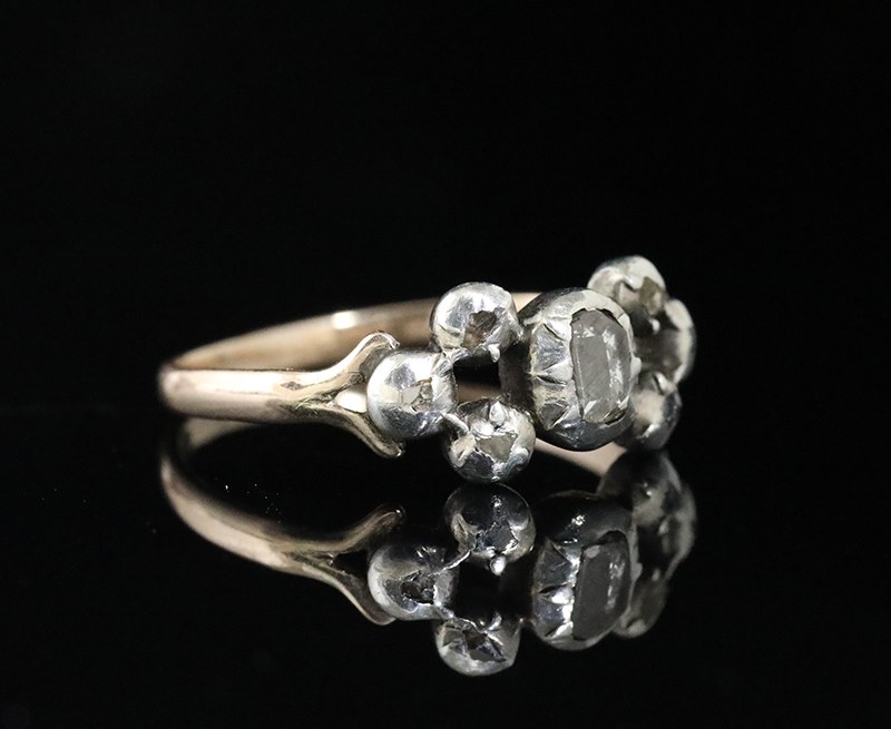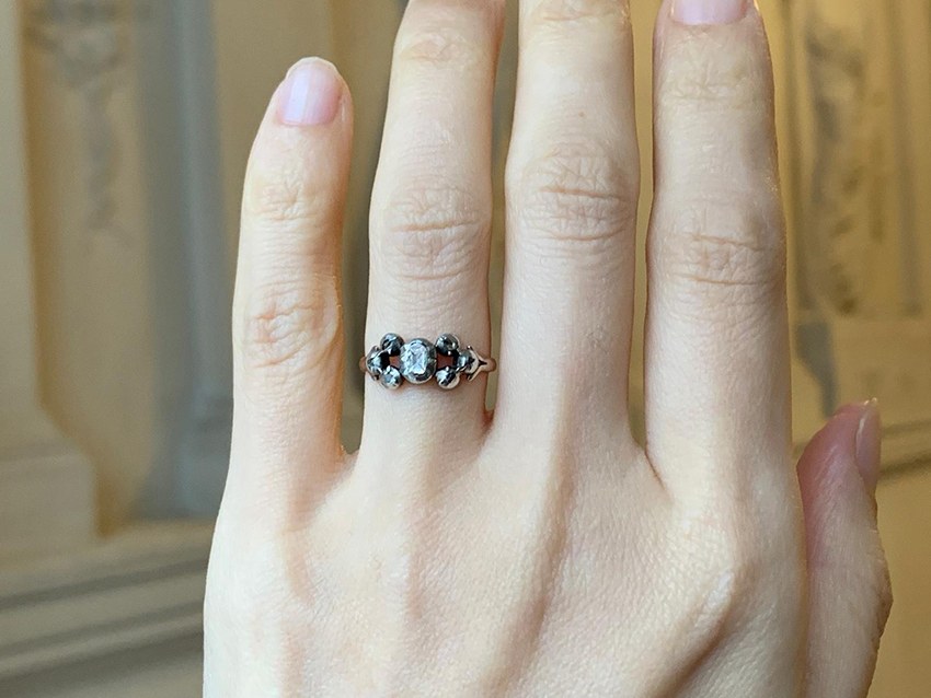Ravissante petite bague « bouquet » en or avec les sertissures en argent, le chaton composé d’une bâte centrale sertie d’un diamant taille ancienne facetté, accostée de 2 fois 3 petites bâtes serties de diamants taillés en rose. Les épaules sont fourchues. Ce modèle de bague dit « bouquet » remonte à la fin du 17e siècle, mais celle-ci date de la fin du 18e siècle et est probablement originaire de Provence.France (Provence ?), fin du 18e