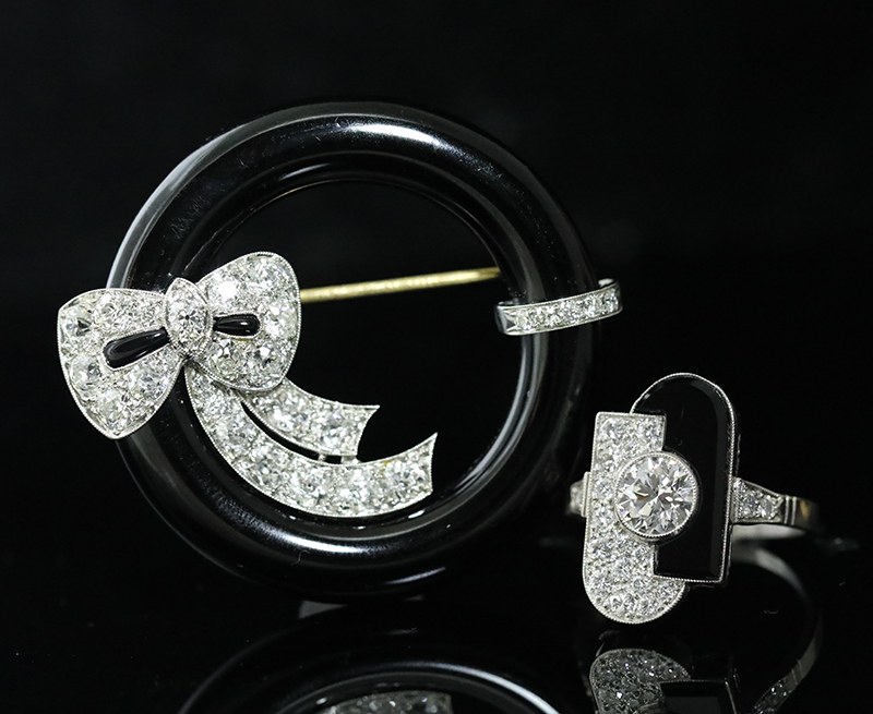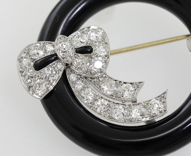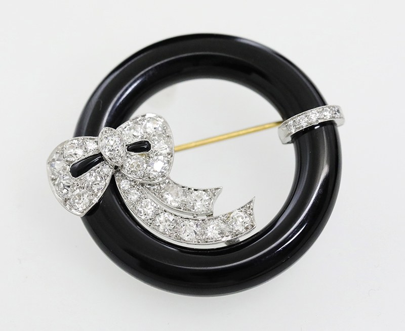 Broche « nœud » Art Déco, platine, onyx et diamants.