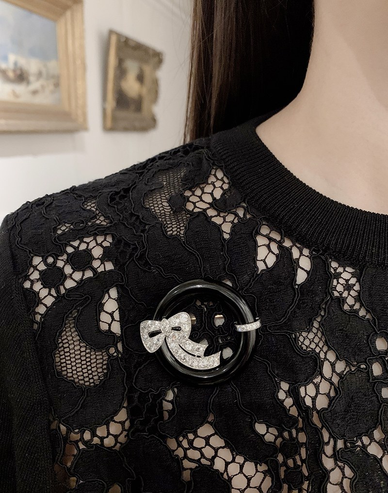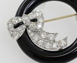 Magnifique broche Art Déco en platine (épingle en or) en forme de fibule ronde constituée d’un cercle d’onyx bombé, rehaussé d’un nœud serti de diamants taillés en brillants (les parties intérieures en onyx) et d’un petit anneau brillanté.Parfait état d’origine.