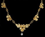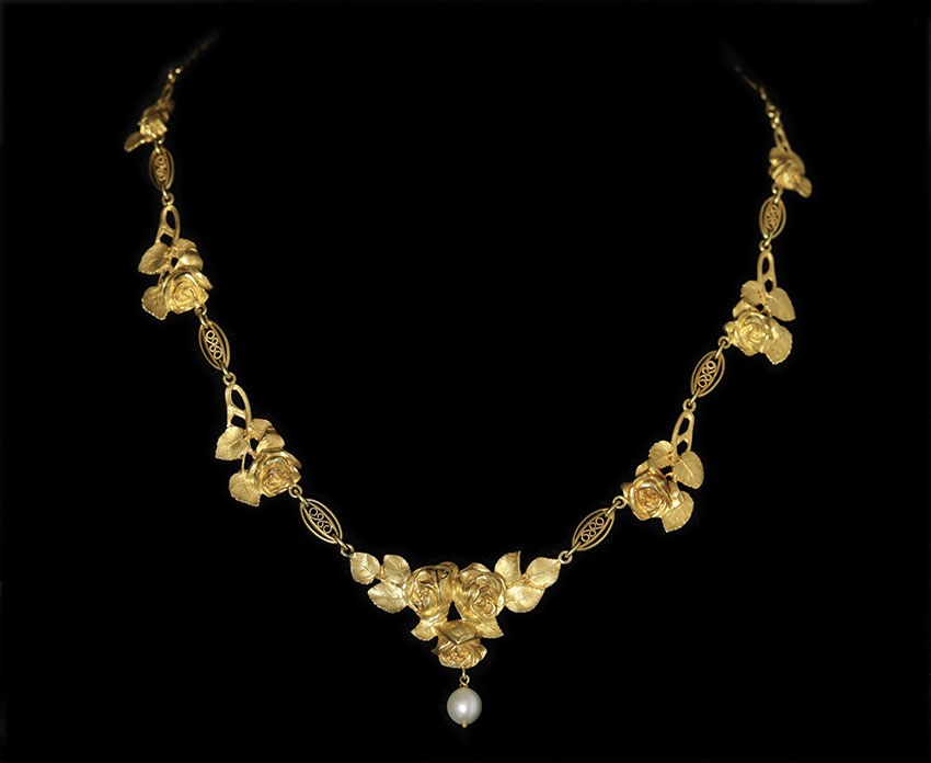 Magnifique collerette en or (18k), à 7 motifs de roses reliés par des maillons décorés de filigranes. Une perle (fine ?) est suspendue en pampille au motif central. L’arrière des feuilles est délicatement gravé. Chaine de sécurité. Très joli travail d’or et parfait état d’origine. Poids : 26.6 grs.France, vers 1900