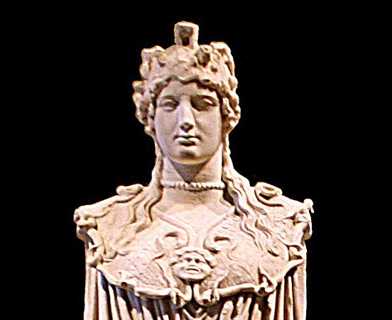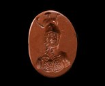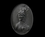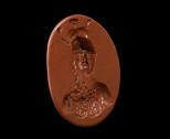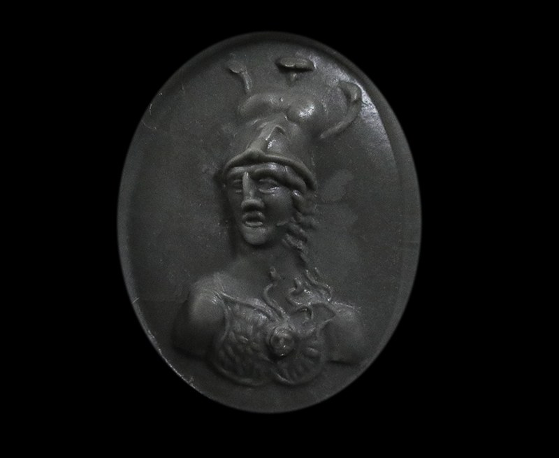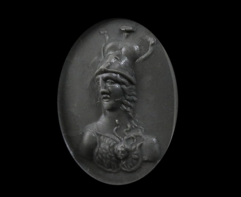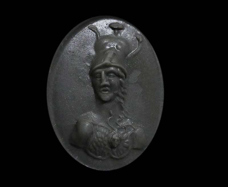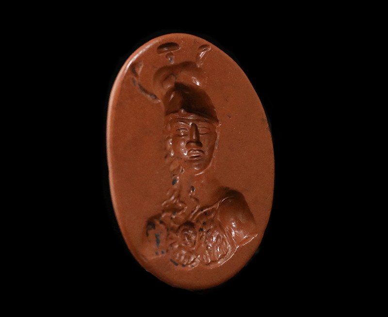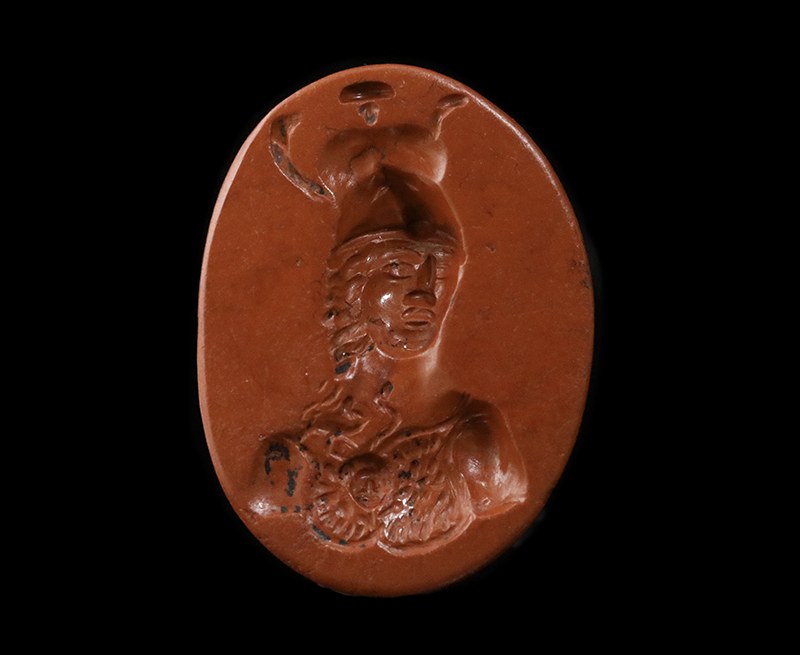 Superbe intaille ovale en jaspe rouge brique gravée d’un buste de face d’Athena Pathenos. La déesse, patronne de la ville d’Athènes, est représentée de face, ce qui est rarissime et lui confère une grande force d’expression. Comme sur la célèbre statue du sculpteur Phidias, datant du 5e siècle avant notre ère, elle est coiffée d’un casque corinthien présentant des excroissances (évocation des ornements du casque de la statue) et vêtue d’un péplos recouvert de l’égine au milieu duquel trône le gorgonéion (la tête de la gorgone Méduse). Magnifique sujet en parfait état de conservation.Dimensions : 19 x 14 x 4 mms.