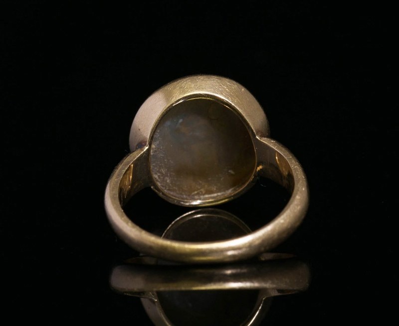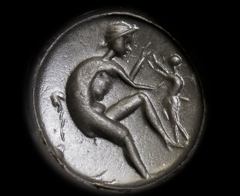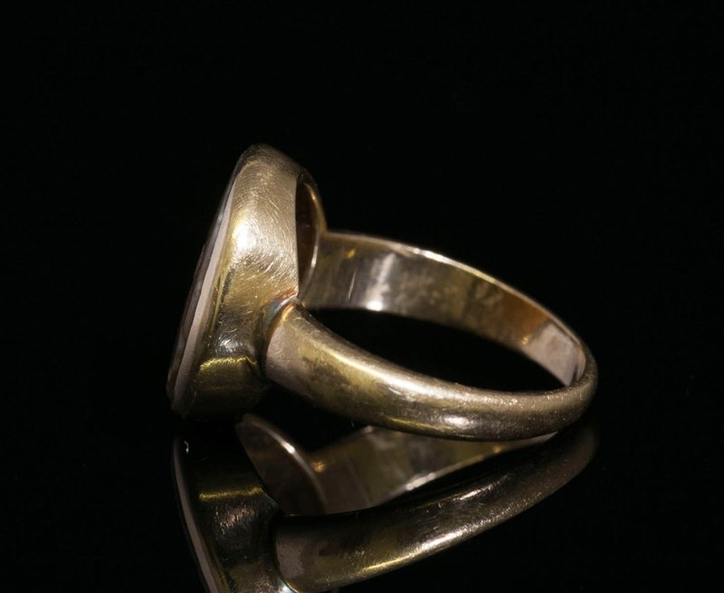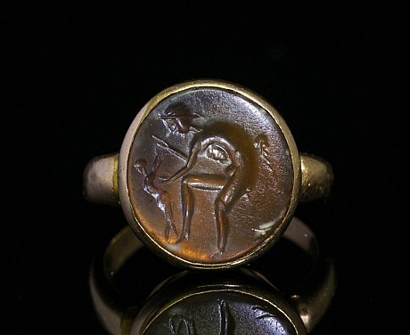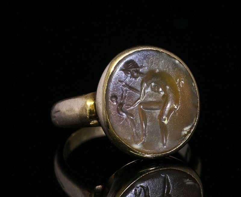 Bague ornée d’une intaille romaine en caldécoine. Satyre et satyreau.