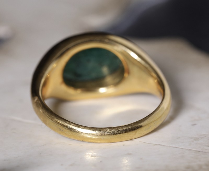 Le chaton ovale est orné d'une intaille romaine gravée sur prase (une calcédoine verte naturelle), de surface bombée (10 x 7 mms), gravée d’une déesse syncrétique Fortuna-Isis, déesse de la fertilité et de la richesse combinant des attributs de la déesse égyptienne Isis et de la déesse romaine Fortuna. Elle est représentée assise sur un trône, vêtue d’un chiton, coiffée du modius (Isis), tenant une corne d’abondance au creux du bras gauche et tendant une patène de la main droite (les mains sont inversées sur l’intaille par rapport à l’empreinte). La composition est belle et bien détaillée, l’attitude est gracieuse. Une telle intaille étant censée apporter à celui ou celle qui la portait la protection de la déesse de la Fortune.Intaille d'époque romaine, second quart du 2e siècle de notre ère.