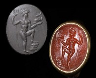Bague en or et intaille romaine sur cornaline. Neptune tenant un dauphin.