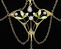 Collier Art Nouveau or 14k, émail et perles de George Krementz.