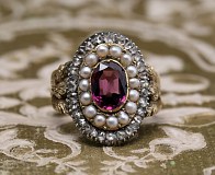 Bague ancienne en diamants, perles et grenat du 19e siècle.