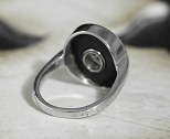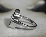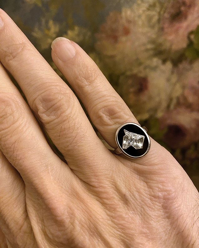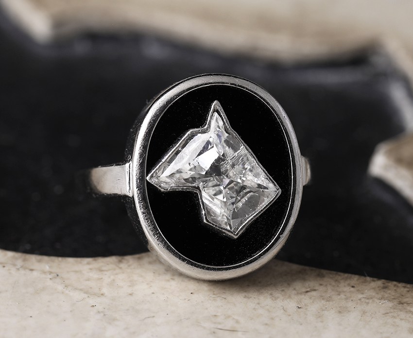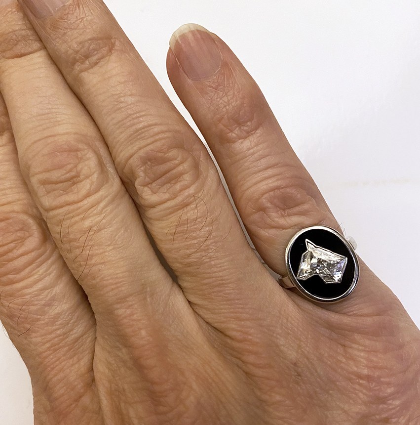 Très originale bague de petit doigt Art Déco en or gris et platine, le chaton ovale présente un diamant taillé à facettes en forme de tête de chien (poids du diamant autour de 1 carat), sur fond d’onyx.France, vers 1930
