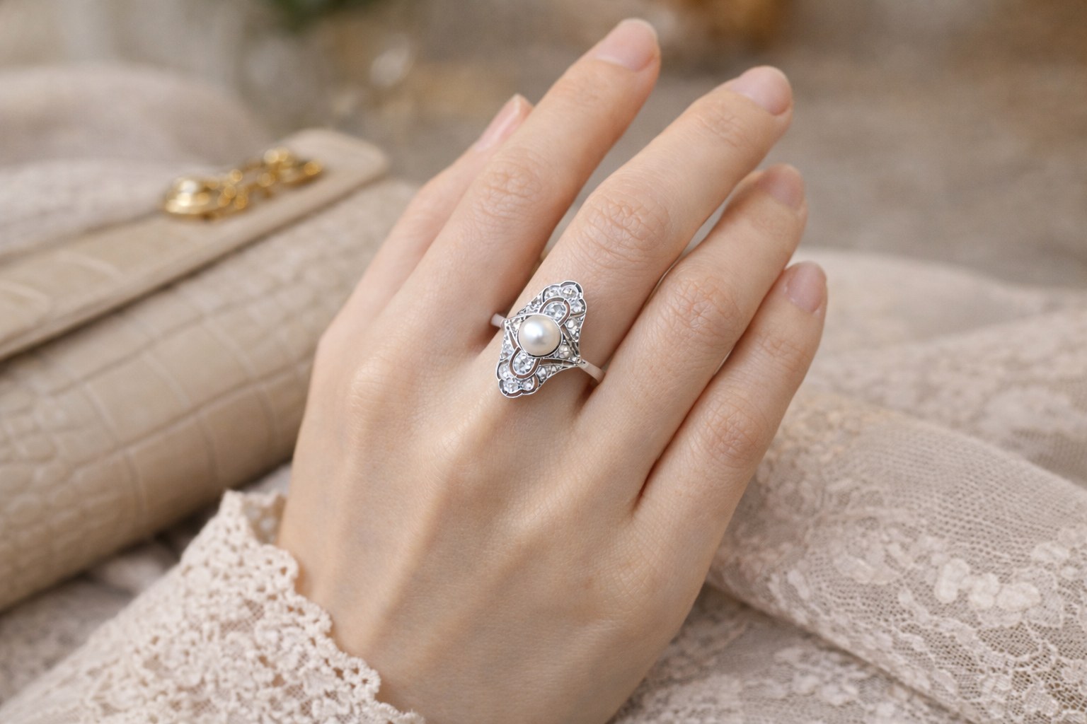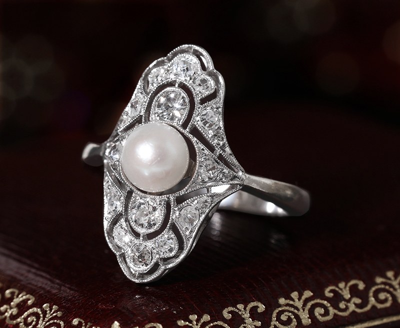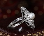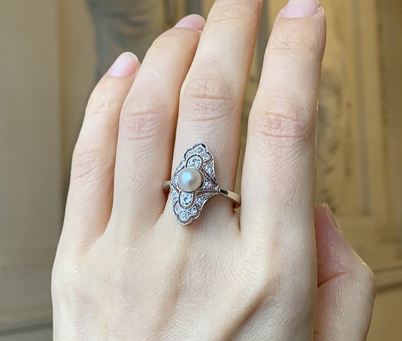 Bague ancienne Art Déco en or gris sertie de diamants et d'une perle.