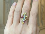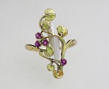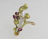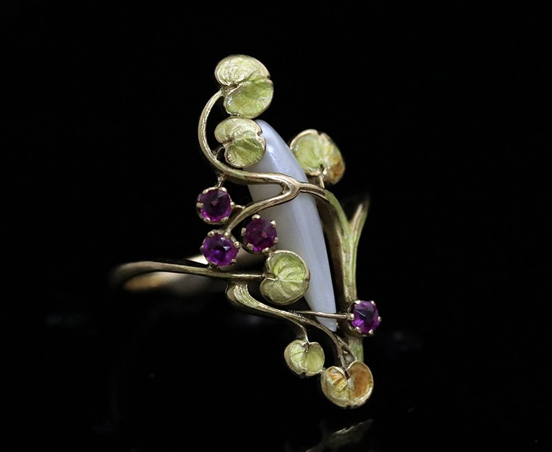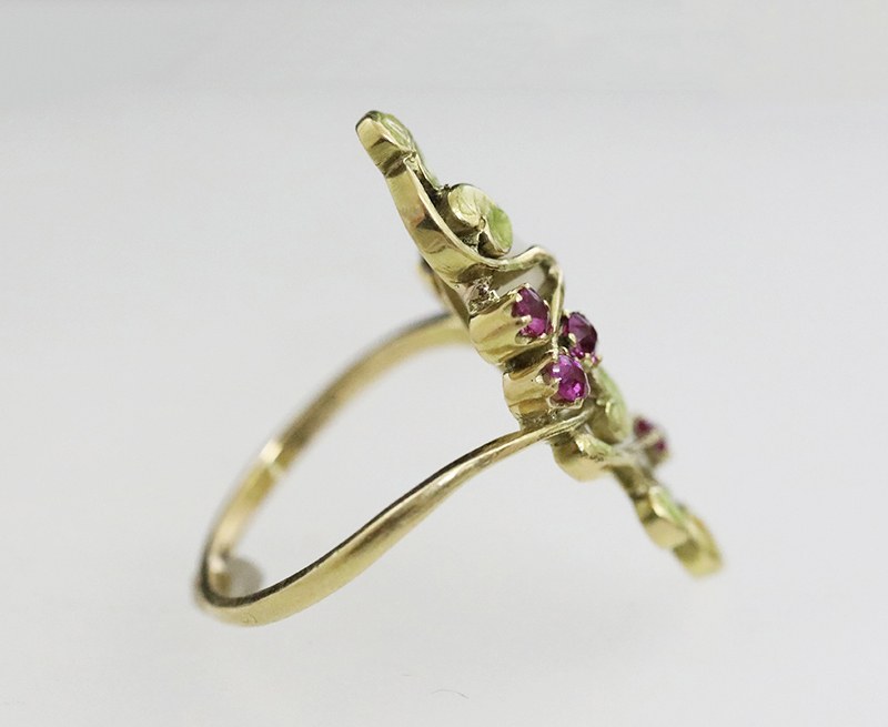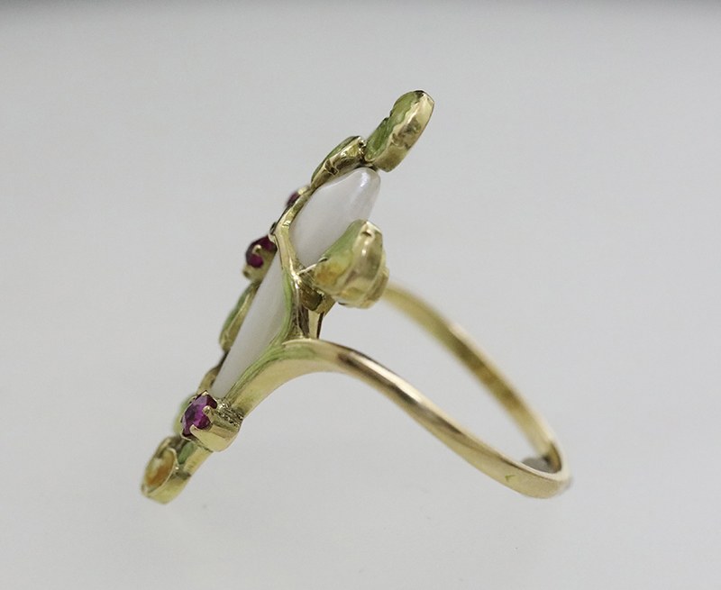 Bague florale Art Nouveau or, émail, rubis et perle, par Henri Dubret.