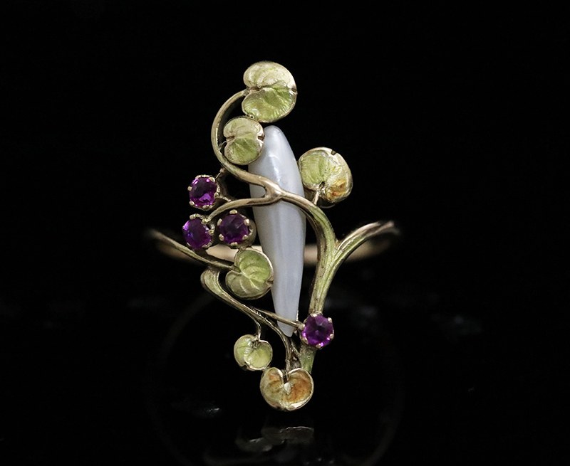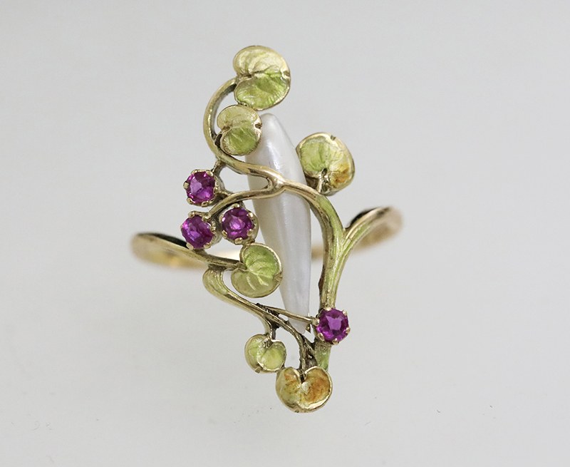 Ravissante bague Art Nouveau en or (18k) à motif floral, le chaton en forme de plante (capucine ?) enroulée autour d’une perle naturelle du Mississipi, les feuilles décorées d’émail translucide, les fleurs représentées par de petits rubis couleur framboise. L’anneau porte un numéro ainsi que la signature et le poinçon de maître d’Henri Dubret (1872 – 1947), un des noms fameux de la bijouterie Art Nouveau, cité dans tous les ouvrages de référence. Parfait état d’origine. Une rare bague de collection.France, 1901-1906