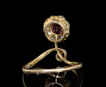 Très charmante bague en forme de fleur, d’un très joli dessin dans l’esprit Art Nouveau (Jugendstil). Le corps est en or 18k. La tête est ornée d’un rubis central de taille coussin, d’un poids d’environ 0,50 carat, d’une couleur « rouge pourpre intense » (« intense purple red »), birman, non chauffé (certificat Carat Gem Lab du 17 septembre 2025). Le rubis est entouré de 8 petits diamants taillés en brillant « taille ancienne ».Parfait état d’origine.