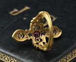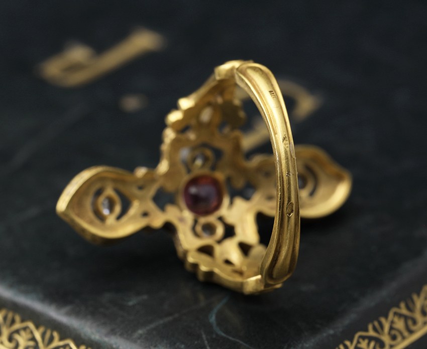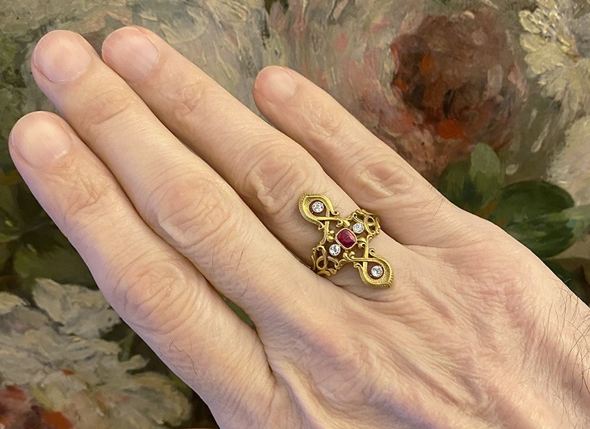 Magnifique bague en or ciselé et patiné, d’un style librement inspiré du style gothique. Le chaton transversal et orné d’un très joli rubis birman d’un rouge vif, encadré de 4 petits brillants sertis en platine. Travail du maître orfèvre Maurice Kalmanovich, d’origine russe, installé à Paris en 1904.France, vers 1905