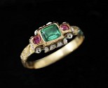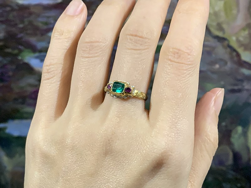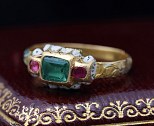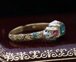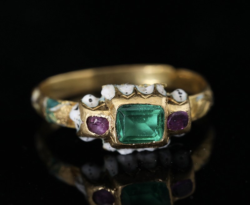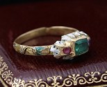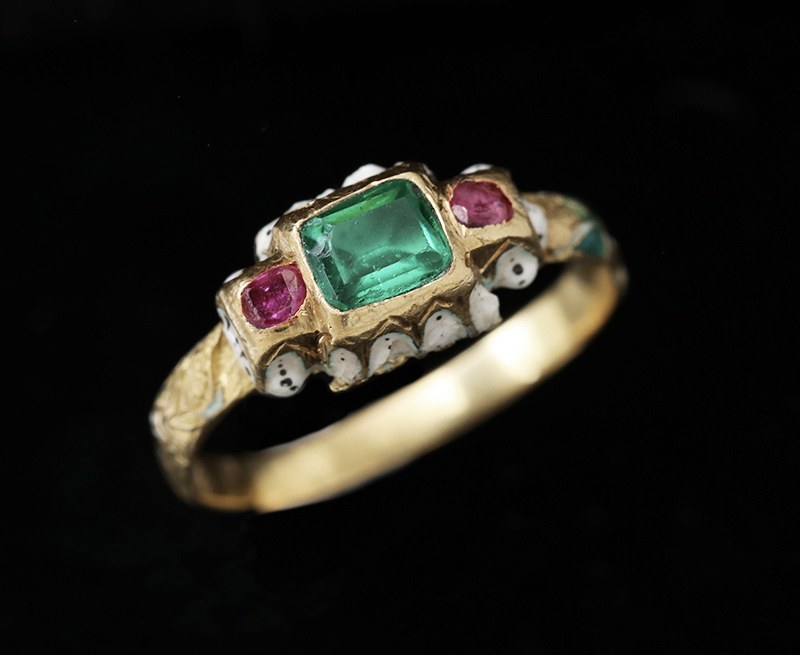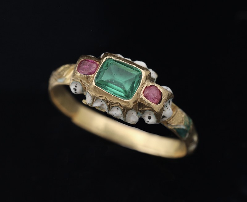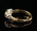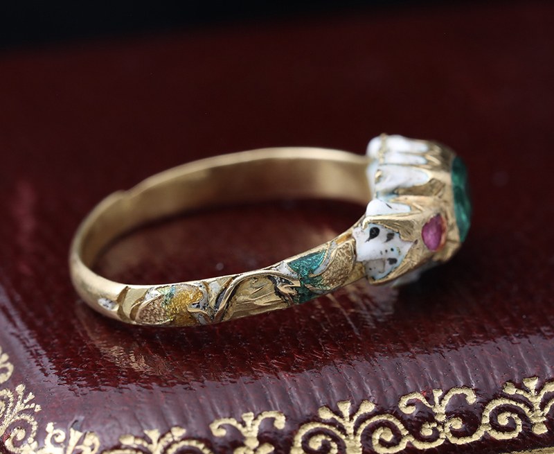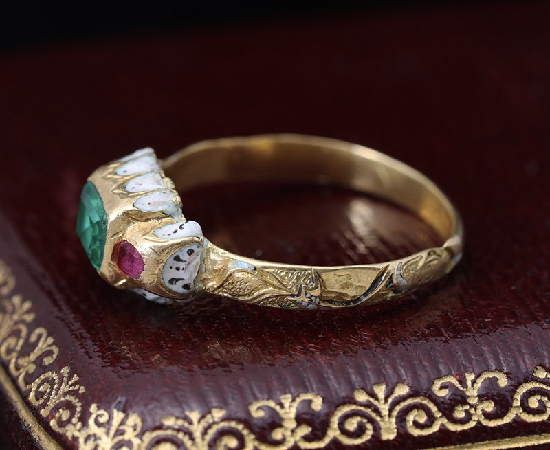Bague en or, émail, émeraude et rubis du 17e siècle.