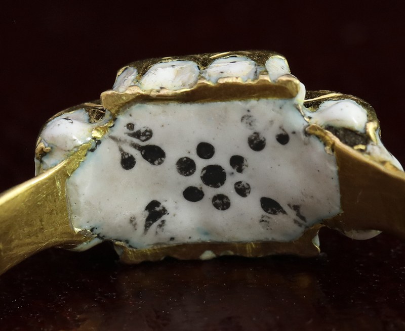 Les bagues en or du 17e siècle sont de la plus grande rareté. Cet exemplaire est d'une merveilleuse fraîcheur avec ses pierres de couleur contrastée qui évoque les bagues giardinetti du siècle suivant. Ce type de bague, réservé à l'aristocratie et la haute bourgeoisie de l'époque, était répandu dans toute l'Europe occidentale, comme le prouvent les tableaux où elles figurent, mais très peu d’entre sont parvenues jusqu’à nous.