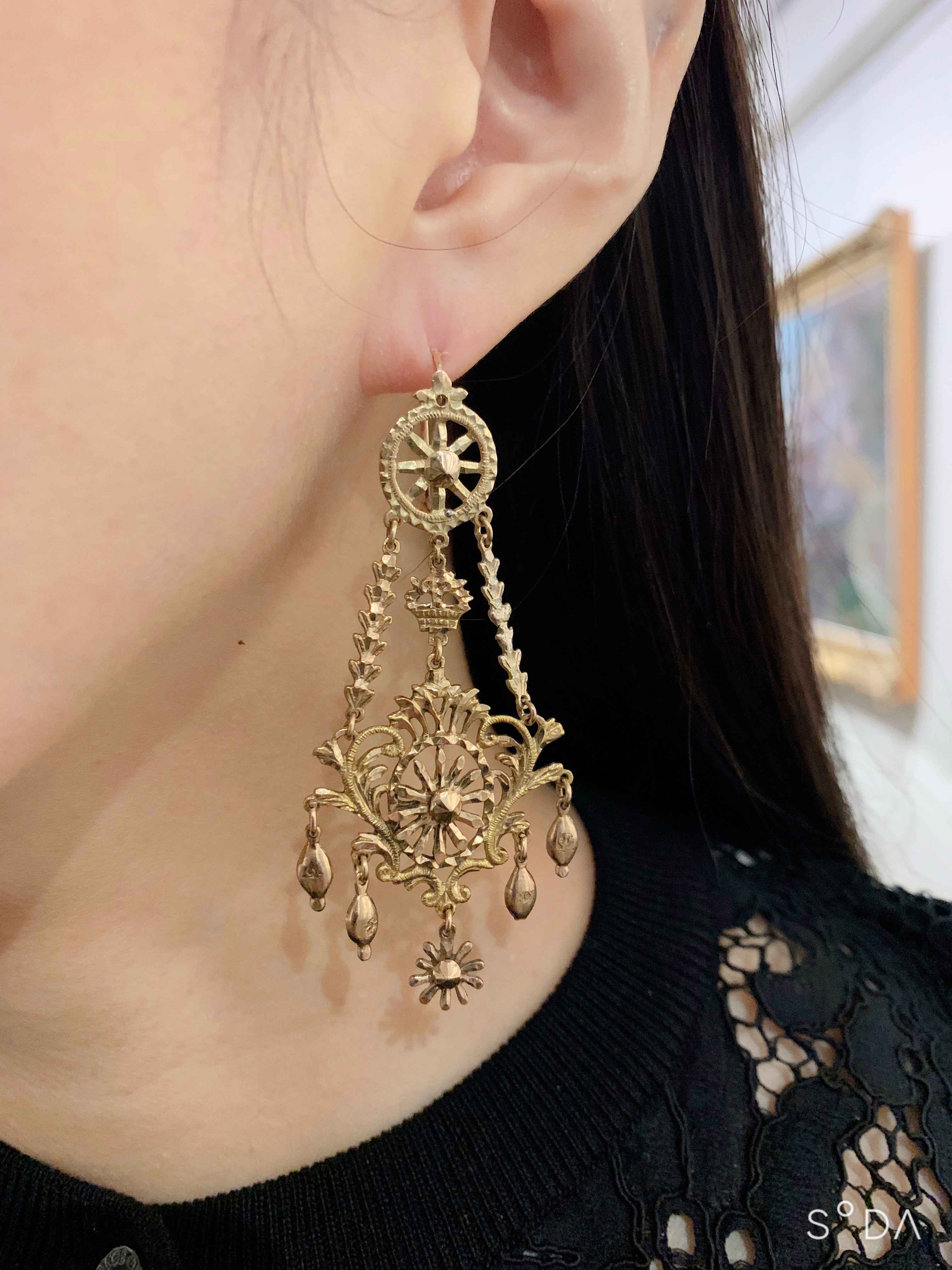 Grande et spectaculaire paire de pendants d’oreille articulés. Ces grands pendants, de forme « girandole », sont réalisés avec art en or ciselé. Compte tenu de l’époque, l’état de conservation est excellent. Seuls les systèmes de fermeture ont été changés à une date postérieure.Ce genre de grandes girandoles, à la fois spectaculaires et légères, très mobiles, étaient portées par les femmes de la haute société dans toute l’Europe occidentale à cette époque. Celle-ci proviennent probablement de Naples ou de Sicile.