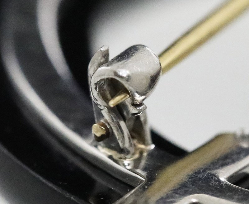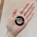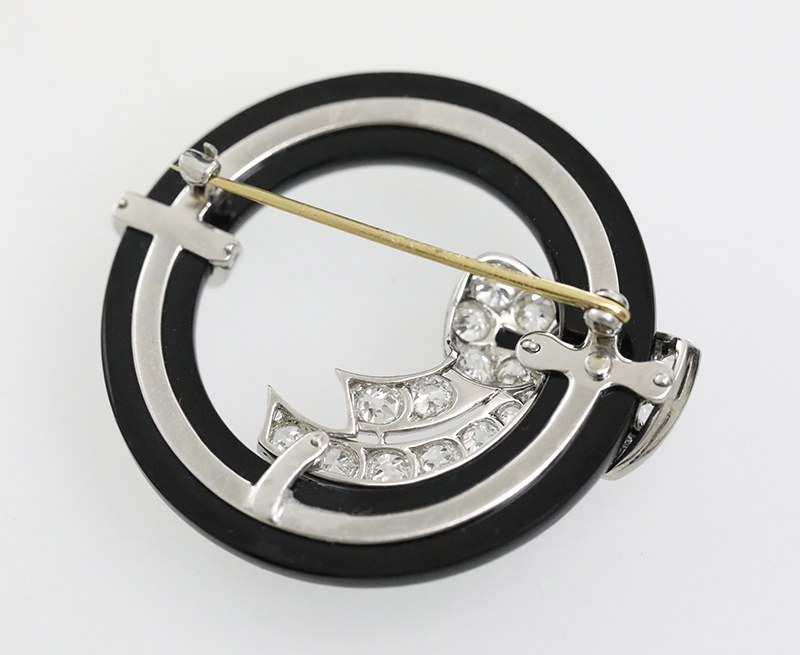 Magnifique broche Art Déco en platine (épingle en or) en forme de fibule ronde constituée d’un cercle d’onyx bombé, rehaussé d’un nœud serti de diamants taillés en brillants (les parties intérieures en onyx) et d’un petit anneau brillanté.Parfait état d’origine.