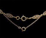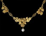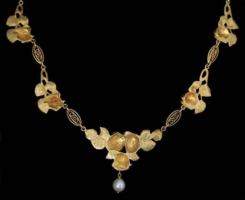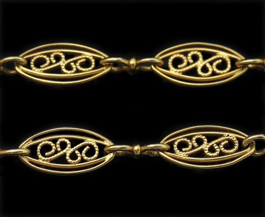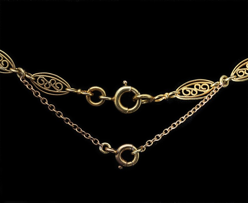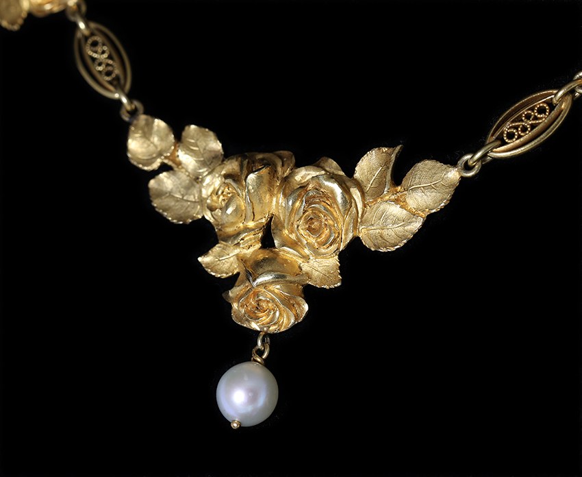 Magnifique collerette en or (18k), à 7 motifs de roses reliés par des maillons décorés de filigranes. Une perle (fine ?) est suspendue en pampille au motif central. L’arrière des feuilles est délicatement gravé. Chaine de sécurité. Très joli travail d’or et parfait état d’origine. Poids : 26.6 grs.France, vers 1900