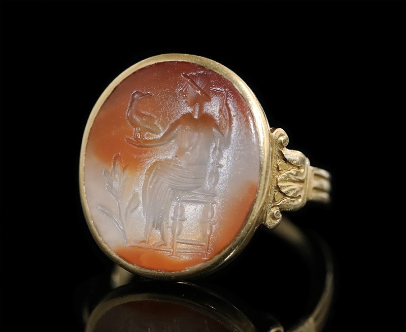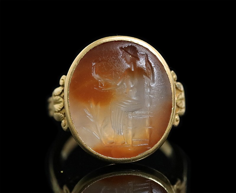 Magnifique bague en or à fond ouvert et chaton oval serti d'une intaille en calcédoine d’une couleur très originale, présentant deux tons : crème et orangé, évoquant un ciel nuageux. L’intaille, de surface légèrement bombée, est gravée d'un Jupiter trônant, appuyé sur son sceptre, tenant un aigle, son animal emblématique, sur son bras tendu. Une tige portant 3 épis de blé, symbole de prospérité, pousse à ses pieds. Le style de la gravure est romain oriental, probablement du Proche-Orient. Parfait état de conservation.La monture en or 18k date de la fin du 19e siècle. De style « archéologique », elle présente des épaules en forme de colonnes cannelée surmontées de chapiteaux. Une frise de grecques court le long de la base du chaton.
