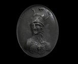 Superbe intaille ovale en jaspe rouge brique gravée d’un buste de face d’Athena Pathenos. La déesse, patronne de la ville d’Athènes, est représentée de face, ce qui est rarissime et lui confère une grande force d’expression. Comme sur la célèbre statue du sculpteur Phidias, datant du 5e siècle avant notre ère, elle est coiffée d’un casque corinthien présentant des excroissances (évocation des ornements du casque de la statue) et vêtue d’un péplos recouvert de l’égine au milieu duquel trône le gorgonéion (la tête de la gorgone Méduse). Magnifique sujet en parfait état de conservation.Dimensions : 19 x 14 x 4 mms.