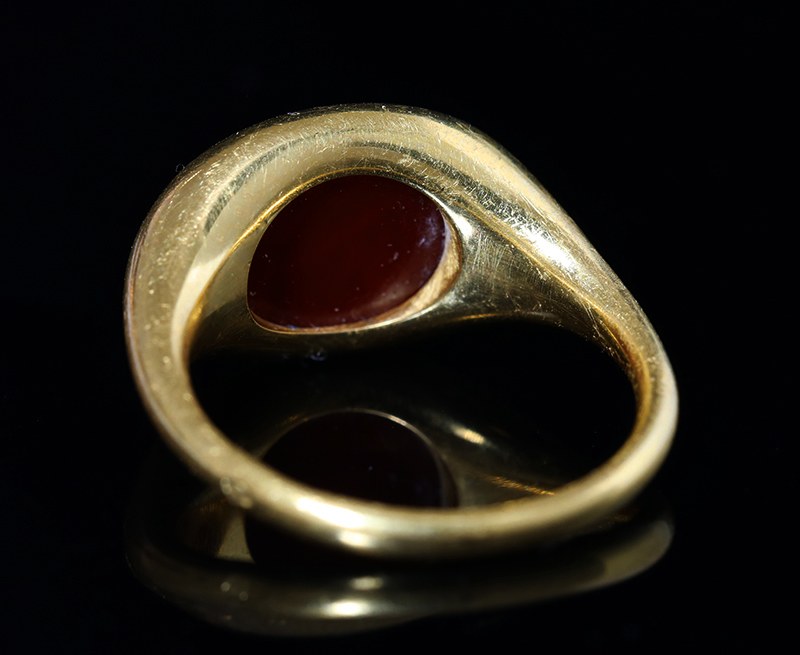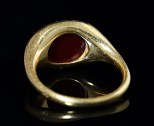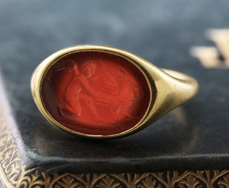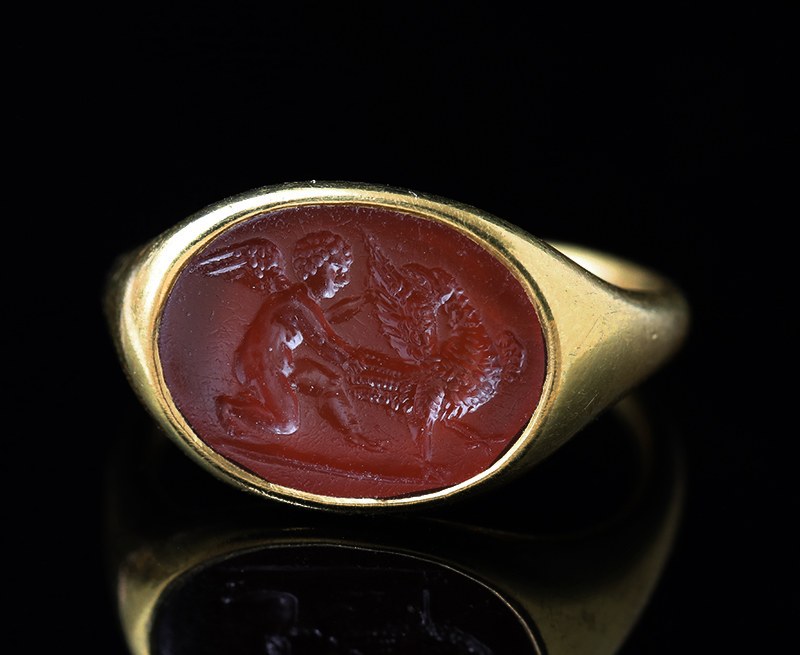 Bague en or à haut titre (plus de 18k) à chaton ovale serti d'une magnifique et rare intaille en cornaline rouge, gravée d’une scène charmante, représentant un jeune Cupidon (Eros) ailé et nu en train d’arracher des plumes à l’aigle de Jupiter. Une scène très originale dans le goût de l’art pompéien où l’on trouve beaucoup de Cupidons farceurs.Parfait état de conservation de l'intaille.