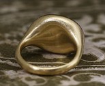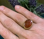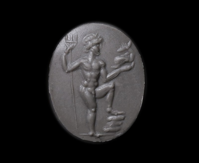 Bague en or à haut titre (plus de 18k) à chaton ovale serti d'une superbe intaille en cornaline rouge orangé, gravée d’une très belle représentation du dieu Neptune, nu, le pied posé sur un rocher, tenant son trident d’une main et un petit dauphin posé sur l’autre main. Cette représation se retrouve sur une monnaie de l’époque d’Hadrien.Parfait état de conservation.