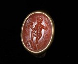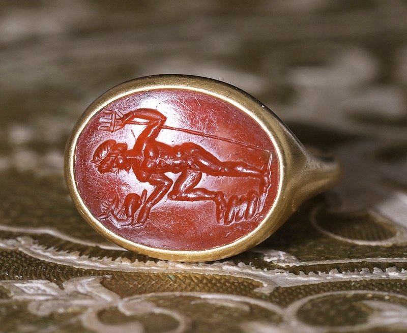 Bague en or et intaille romaine sur cornaline. Neptune tenant un dauphin.