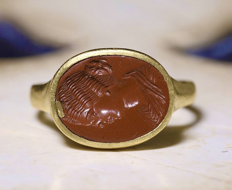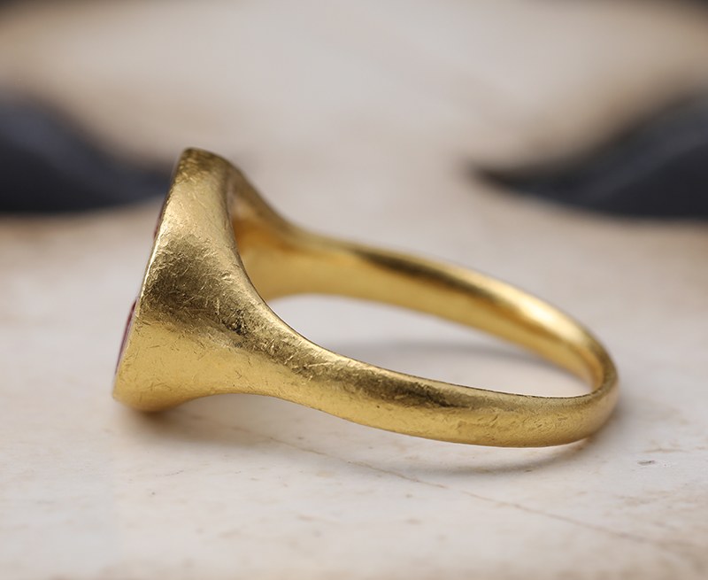 Bague or et intaille romaine sur jaspe rouge. Faustine la Jeune.
