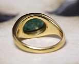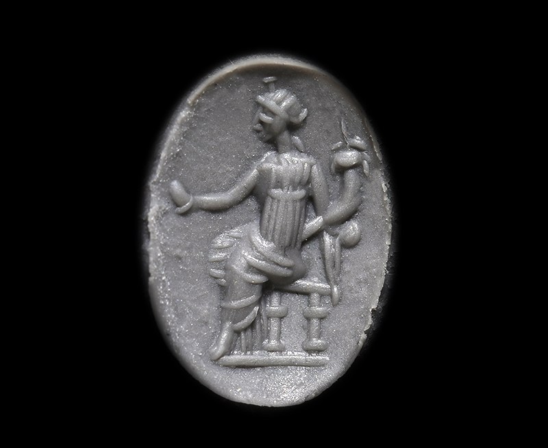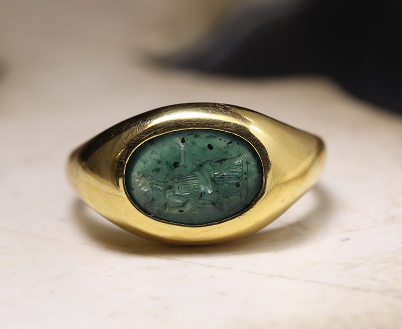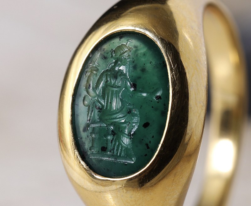 Le chaton ovale est orné d'une intaille romaine gravée sur prase (une calcédoine verte naturelle), de surface bombée (10 x 7 mms), gravée d’une déesse syncrétique Fortuna-Isis, déesse de la fertilité et de la richesse combinant des attributs de la déesse égyptienne Isis et de la déesse romaine Fortuna. Elle est représentée assise sur un trône, vêtue d’un chiton, coiffée du modius (Isis), tenant une corne d’abondance au creux du bras gauche et tendant une patène de la main droite (les mains sont inversées sur l’intaille par rapport à l’empreinte). La composition est belle et bien détaillée, l’attitude est gracieuse. Une telle intaille étant censée apporter à celui ou celle qui la portait la protection de la déesse de la Fortune.Intaille d'époque romaine, second quart du 2e siècle de notre ère.