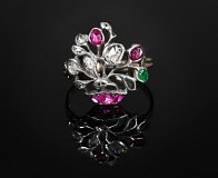 Bague « bouquet » en or, émail et rubis du 17e siècle.