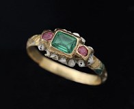 Bague en or, émail, émeraude et rubis du 17e siècle.